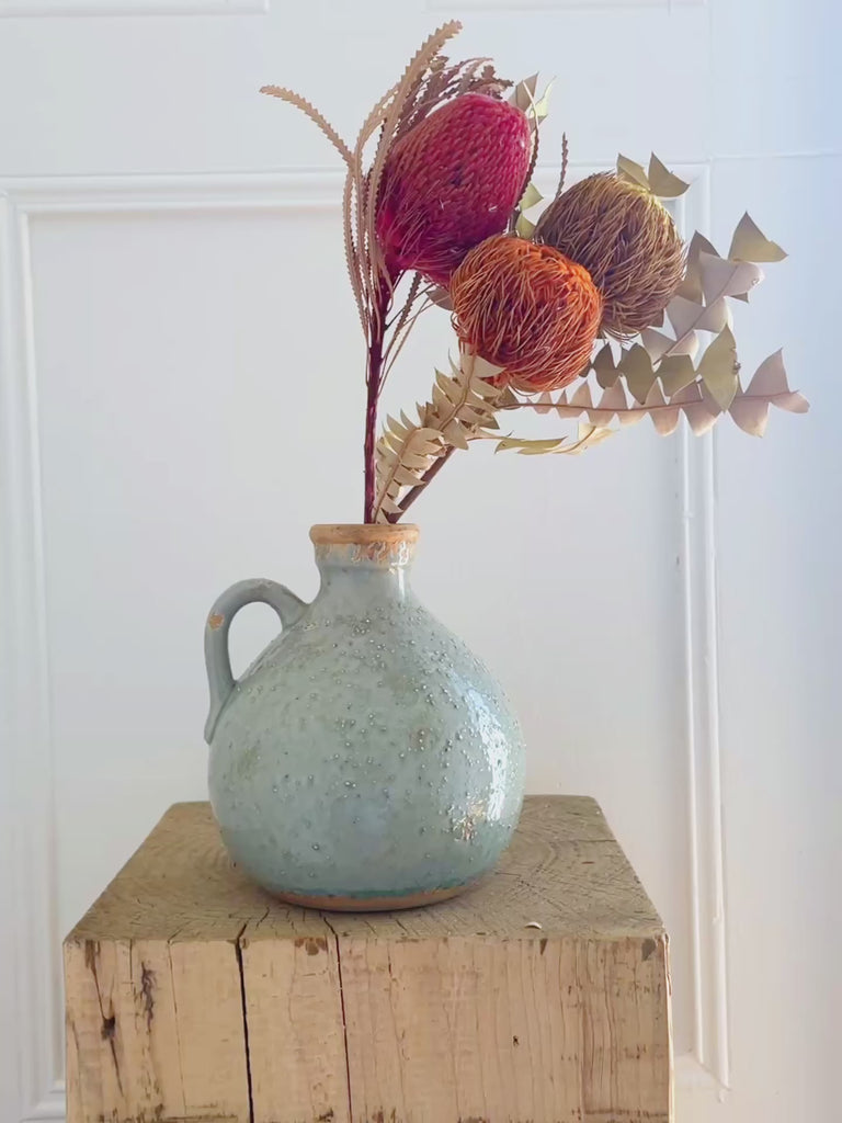 Delphi is a vintage-style ceramic jug vase with a single handle, rounded body, and a soft blue-grey crackled glaze. Its aged finish and raw terracotta detailing give it the feel of a found antique. Perfect as a sculptural vase for dried stems or styled as a standalone home decor accent on shelves or consoles. Delphi adds rustic charm and timeless texture to coastal, French country, or collected interiors.