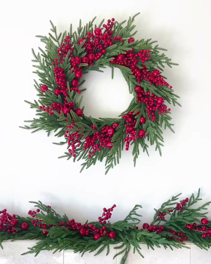 Bring timeless holiday elegance to your home with this 24" Red Apple & Berry Norfolk Pine Wreath. Crafted with lifelike “real touch” Norfolk pine greenery, it’s accented with glossy red berries and realistic faux apples for a pop of festive charm. Perfect for front doors, mantels, or walls, this high-end artificial wreath offers the look of fresh-cut pine without the maintenance. Ideal for traditional, farmhouse, or classic Christmas decor.