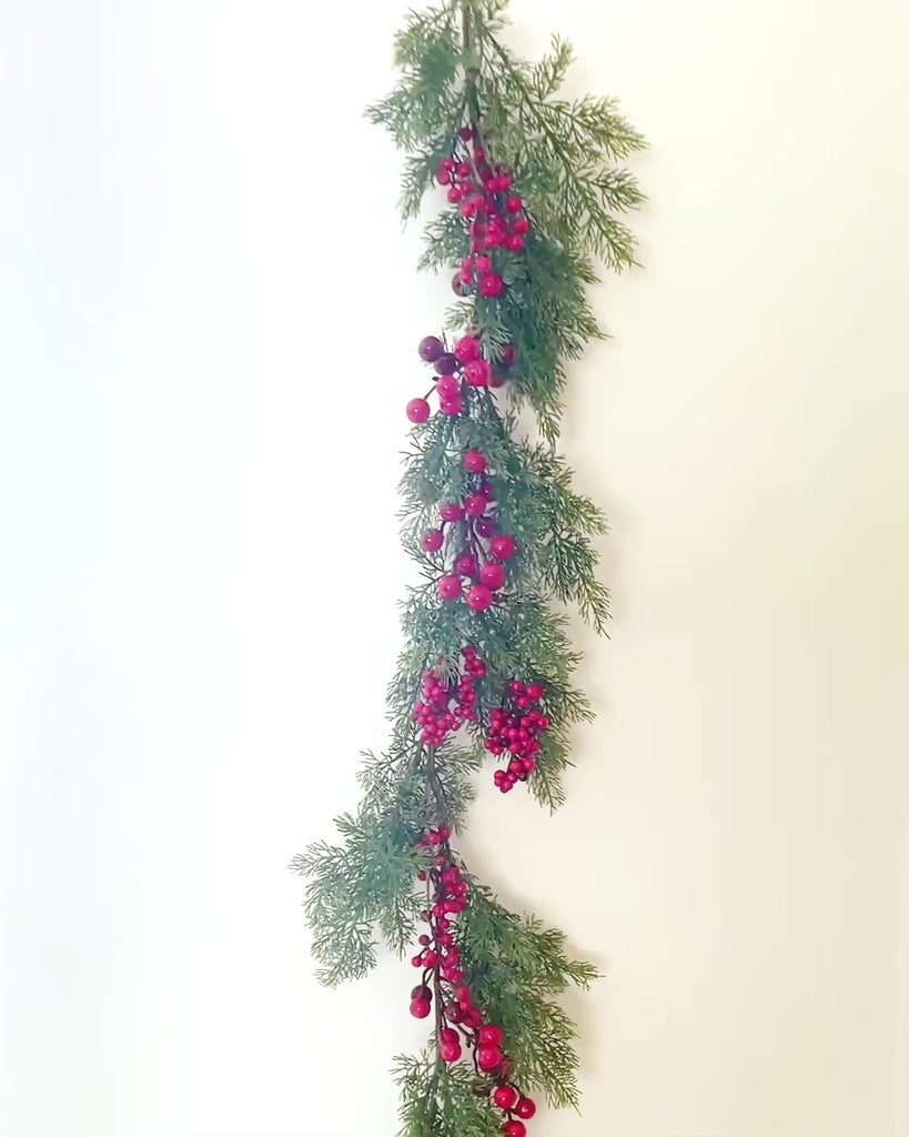 Elevate your holiday decorating with this 60" Red Berry Cypress Garland. Made with lush “real touch” cypress greenery and clusters of vibrant red berries, this high-quality artificial garland is perfect for mantels, banisters, tabletops, and doorways. Its realistic texture and rich color bring warmth and elegance to any space. A reusable décor piece you’ll enjoy season after season.